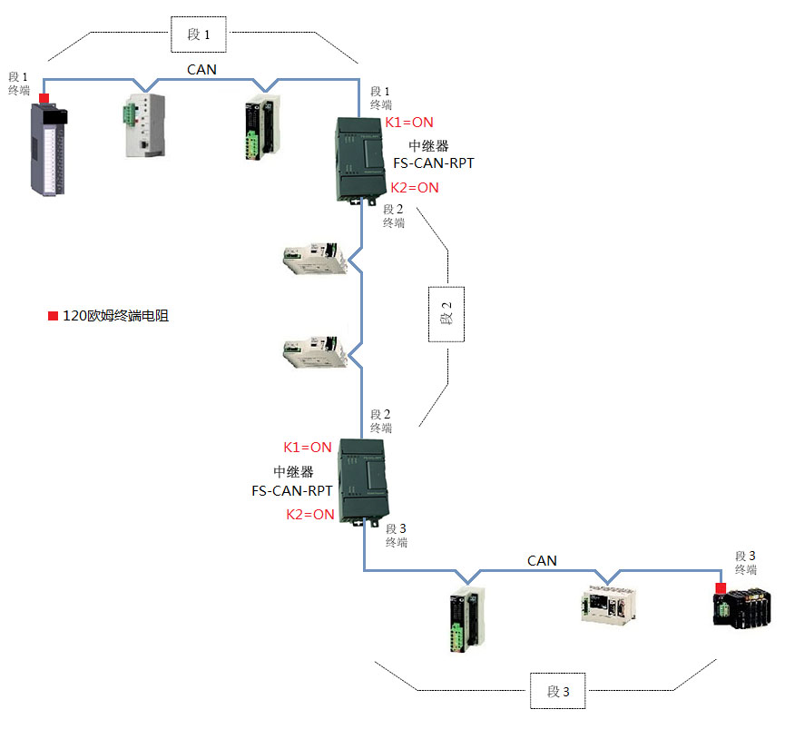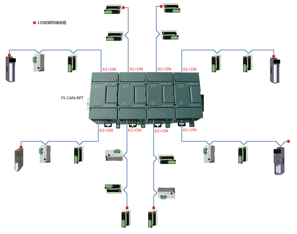 可擴(kuò)展數(shù)量 | 單個使用作為中繼器,N個可組合成2N口集線器。最多可以擴(kuò)展10臺FS-CAN-RPT組合成20口集線器。 |