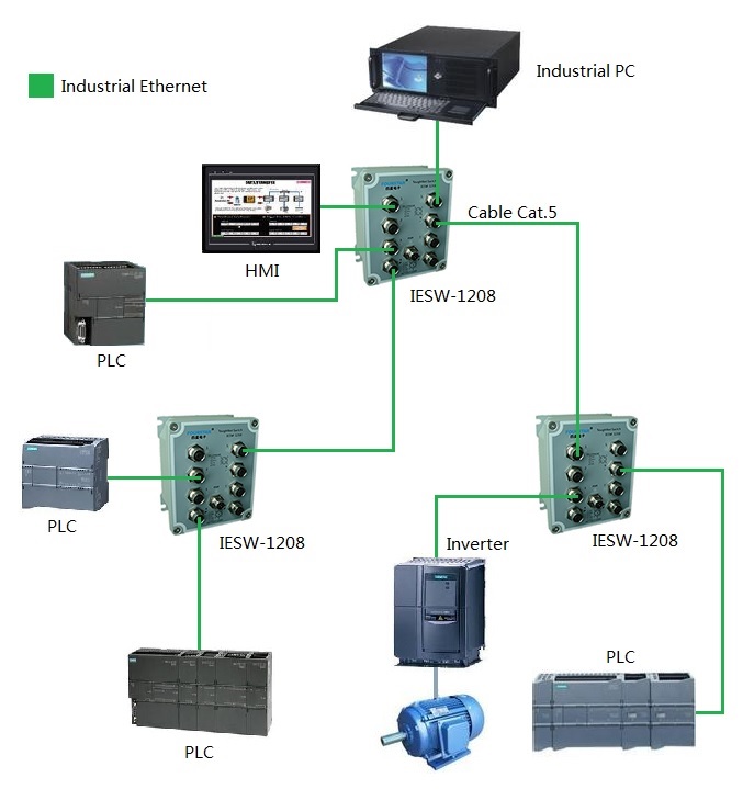 M12接口寬溫堅(jiān)固型8口非網(wǎng)管工業(yè)以太網(wǎng)交換機(jī)。IP67防護(hù)等級(jí),符合IEEE802.3,10/100Base-TX工業(yè)以太網(wǎng)標(biāo)準(zhǔn),網(wǎng)口速率10/100M自適應(yīng),具有廣播風(fēng)暴抑制功能,帶有電源、以太網(wǎng)端口狀態(tài)指示燈。各網(wǎng)口之間及電源端口相互隔離,工業(yè)級(jí)標(biāo)準(zhǔn)設(shè)計(jì),背板螺釘安裝, -40~+85℃工業(yè)級(jí)寬溫型??蓮V泛的用于PLC、HMI、VVVF、DCS等各種基于工業(yè)以太網(wǎng)的工控設(shè)備。