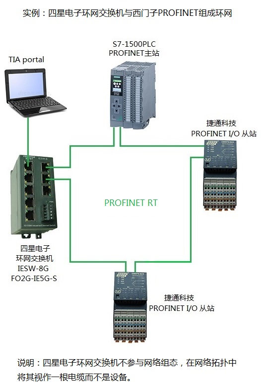 德陽四星電子技術(shù)有限公司的8口千兆環(huán)網(wǎng)交換機(jī)IESW-8G和2光5電千兆環(huán)網(wǎng)交換機(jī)FO2G-IE5G-S,支持PROFINET等工業(yè)以太網(wǎng),并支持單環(huán)、雙環(huán)和多環(huán)等環(huán)網(wǎng)拓?fù)?,在網(wǎng)絡(luò)拓?fù)浣M態(tài)時,只需將其視為一根電纜,而不是作為設(shè)備參與組態(tài)。下面是用于西門子S7-1200PLC和S7-1500PLC的PROFINET RT的應(yīng)用實(shí)例:
