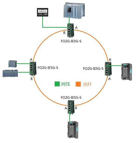使用FO2G-IE5G-S(型號(hào)中帶G的支持環(huán)網(wǎng))光纖適配器升級(jí)為光纖環(huán)網(wǎng)如圖2-3所示,由于FO2G-IE5G-S光纖適配器本身具有環(huán)網(wǎng)功能,所以在PROFINET網(wǎng)絡(luò)組態(tài)中不能組態(tài)成環(huán)網(wǎng)。特別適合不具備環(huán)網(wǎng)功能的設(shè)備或只有一個(gè)網(wǎng)口的設(shè)備組成光纖環(huán)網(wǎng),也可組成網(wǎng)線環(huán)網(wǎng)或光纖網(wǎng)線混合環(huán)網(wǎng)。