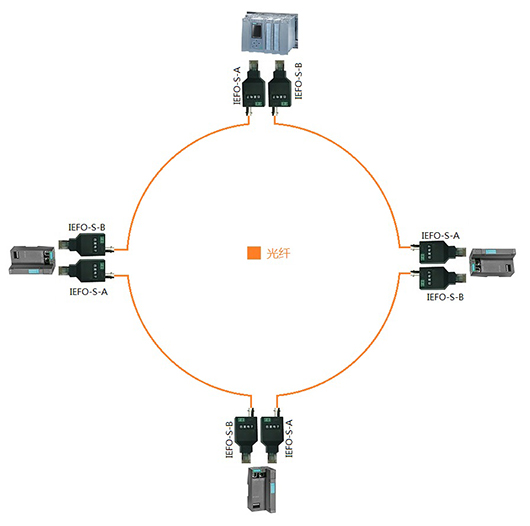 使用IEFO-S-A和IEFO-S-B光纖適配器升級(jí)為光纖環(huán)網(wǎng)如圖2-2所示,特點(diǎn)是PROFINET網(wǎng)絡(luò)組態(tài)同電纜環(huán)網(wǎng)相同,即組態(tài)成環(huán)網(wǎng),其功能與網(wǎng)線連接時(shí)完全相同。