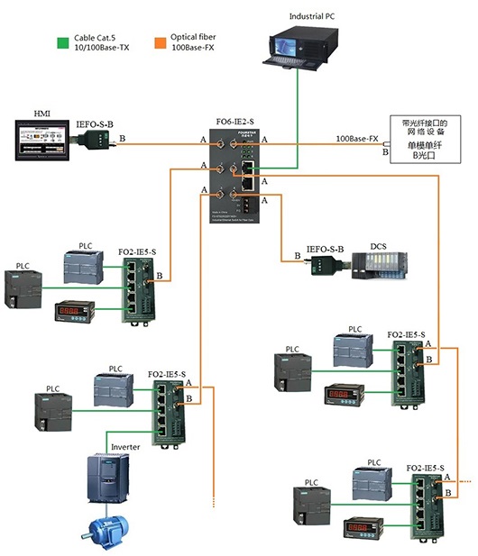 下面的幾種工業(yè)以太網(wǎng)光纖傳輸方案,可將以太網(wǎng)電纜傳輸升級(jí)為光纖傳輸,可實(shí)現(xiàn)工控系統(tǒng)傳統(tǒng)的手牽手光纖總線型拓?fù)?、以太網(wǎng)光纖環(huán)網(wǎng)拓?fù)?、以太網(wǎng)光纖星型拓?fù)湟约案鞣N混合型拓?fù)浣Y(jié)構(gòu)??蓮V泛的用于PLC、HMI、VVVF、DCS等各種基于工業(yè)以太網(wǎng)的工控設(shè)備,完美支持各種工業(yè)以太網(wǎng)上層通訊協(xié)議,如PROFINET(IRT除外)、MODBUS TCP/IP、Ethernet/IP、EtherCAT、CC-Link IE、POWERLINK等所有工業(yè)以太網(wǎng)。