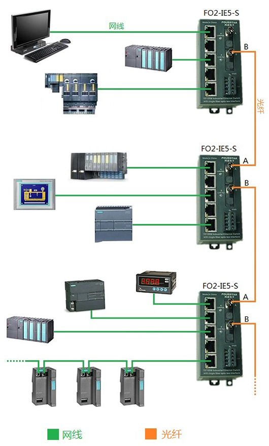 升級(jí)成總線型光纖網(wǎng)絡(luò)可以使用四星電子的迷你型工業(yè)以太網(wǎng)光纖適配器IEFO-S-A(A光口)和IEFO-S-B(B光口)或單纖2光5電工業(yè)以太網(wǎng)光纖鏈路適配器FO2-IE5-S。光纖的連接安裝A光口連B光口、B光口連A光口的原則連接。