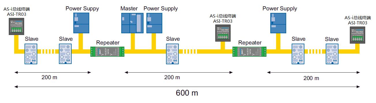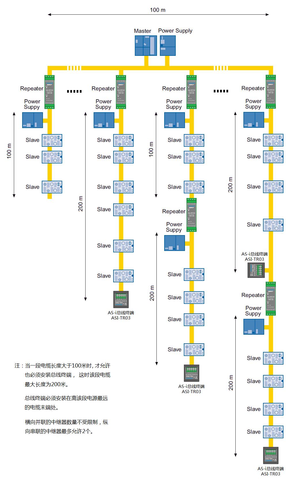 1、AS-Interface中繼器串聯(lián)連接拓撲: