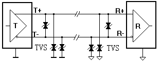 由于本裝置采用平衡差分傳輸方式,因而具有良好的抗電磁干擾能力,光電隔離電路能有效的抑制地電位差的干擾。采用屏幕電纜對抑制射頻干擾很有效,但屏蔽電纜線的電容較大,會(huì)相應(yīng)降低通訊速率。除上述常見干擾因素外,瞬態(tài)電壓干擾是威脅通訊接口安全的元兇之一。