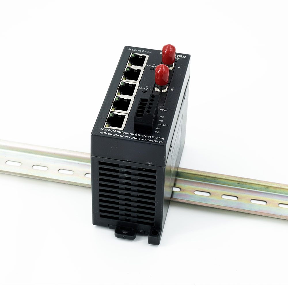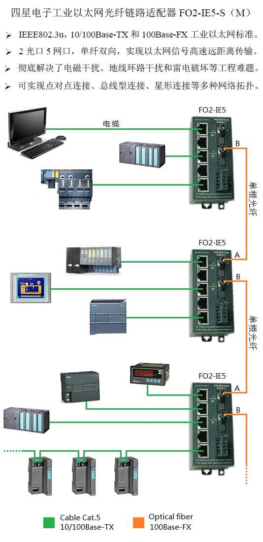 單纖2光5電工業(yè)以太網(wǎng)多模光纖鏈路適配器。2對單纖接口和5個(gè)RJ45以太網(wǎng)交換機(jī)電接口,符合IEEE802.3u,10/100Base-TX和100Base-FX工業(yè)以太網(wǎng)標(biāo)準(zhǔn),網(wǎng)口速率10/100M自適應(yīng),光口速率100M,電源端口-網(wǎng)口-光纖端口全部隔離,光纖接頭標(biāo)配ST接頭,適用光纖:多模62.5/125um、50/125um,最大傳輸距離5km。DIN35mm標(biāo)準(zhǔn)導(dǎo)軌安裝或螺栓固定安裝,-20~+75℃工業(yè)級寬溫型。