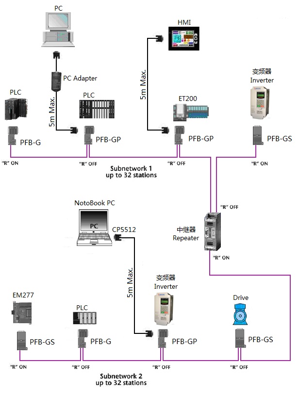 ● 一段總線上最多可掛32個(gè)PFB-GS,加裝PROFIBUS中繼器或集線器可增加至數(shù)百個(gè)站點(diǎn)。