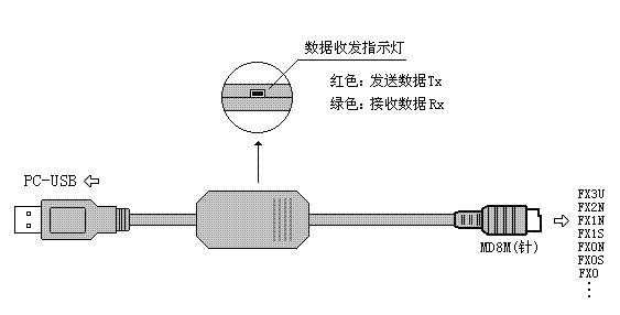 三菱FX3U和FX2N/FX1N/FX0/FX0S/FX1S...系列PLC的USB編程電纜,USB/RS422接口,帶通信指示燈,最大通信距離可達(dá)2公里。