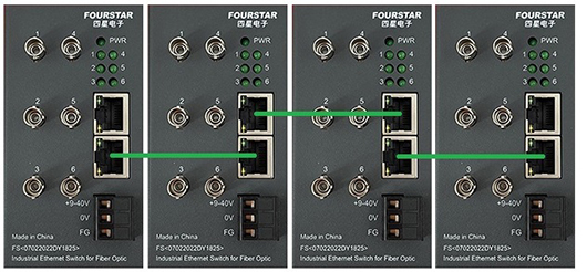 將多個(gè)FO6-IE2-S的網(wǎng)口依次級(jí)聯(lián)起來,就可組合成更多光口的光纖交換機(jī),如圖3-2所示,4臺(tái)FO6-IE2-S的網(wǎng)口級(jí)聯(lián)后組合成4×6=24個(gè)光口的光纖交換機(jī),以此類推。